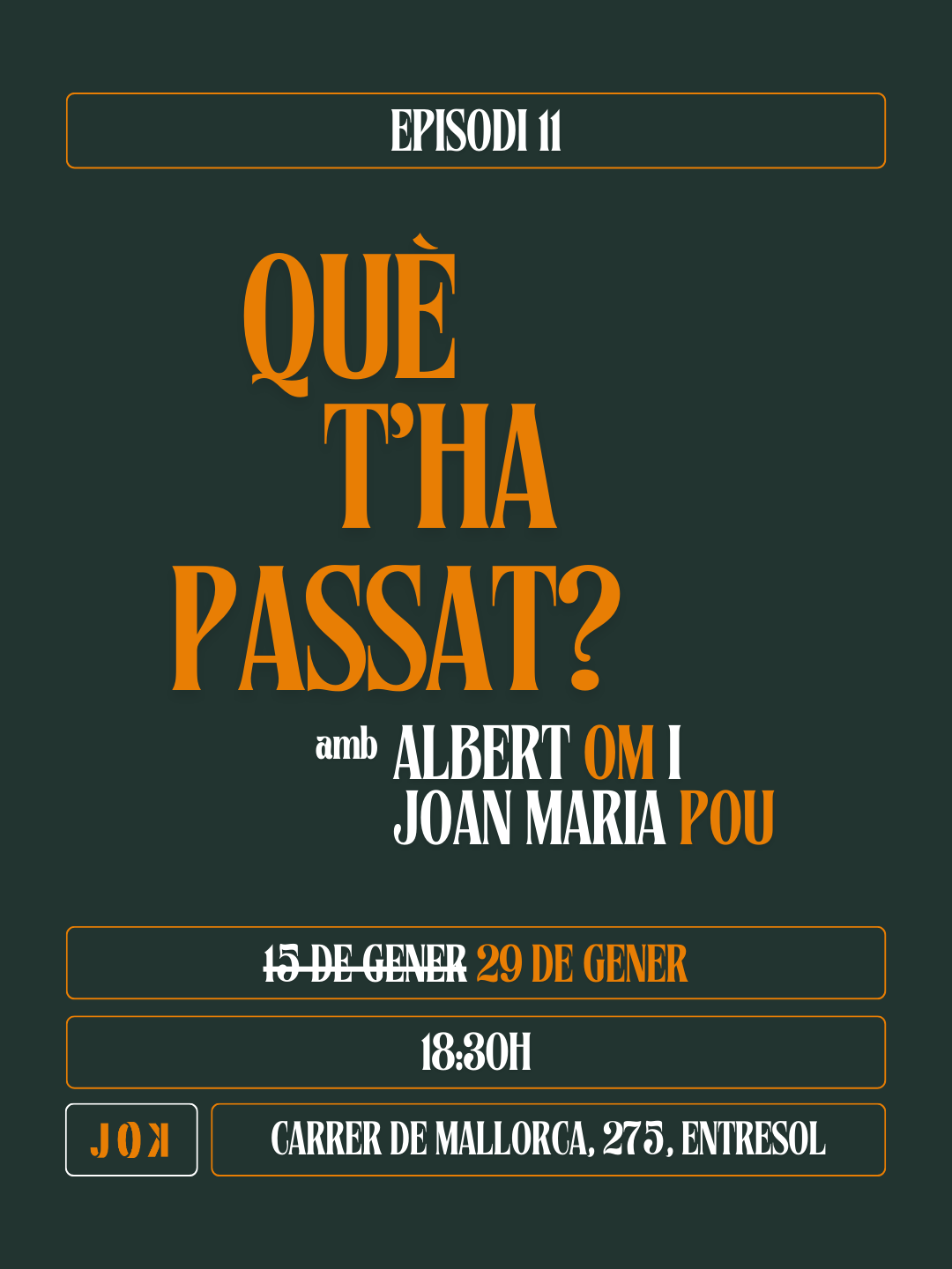 Pots escoltar-nos a Spotify, Apple Podcasts i iVoox, o bé en directe des de la cocteleria del JOK. Podeu comprar la vostra entrada pel proper episodi des d’aquesta pàgina.